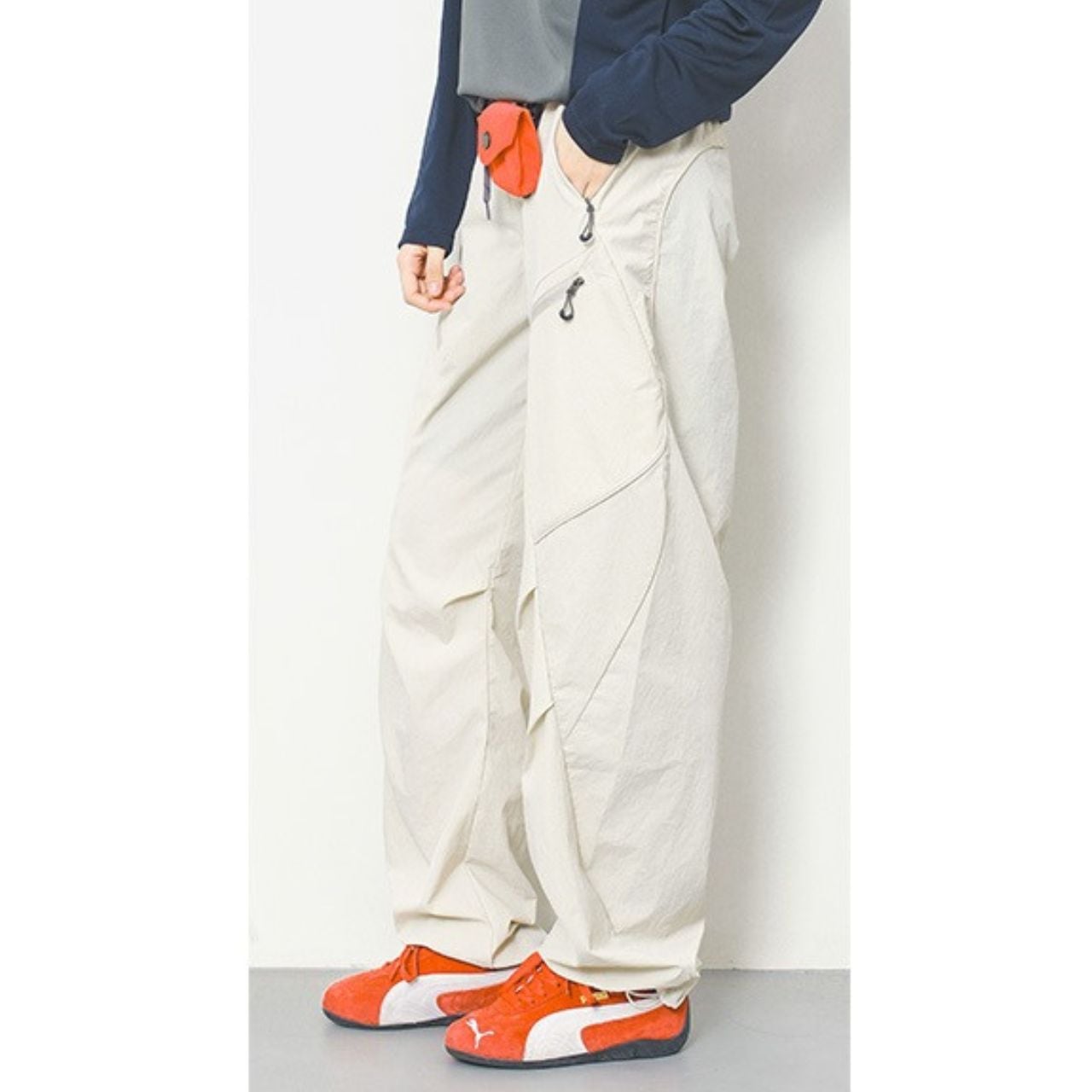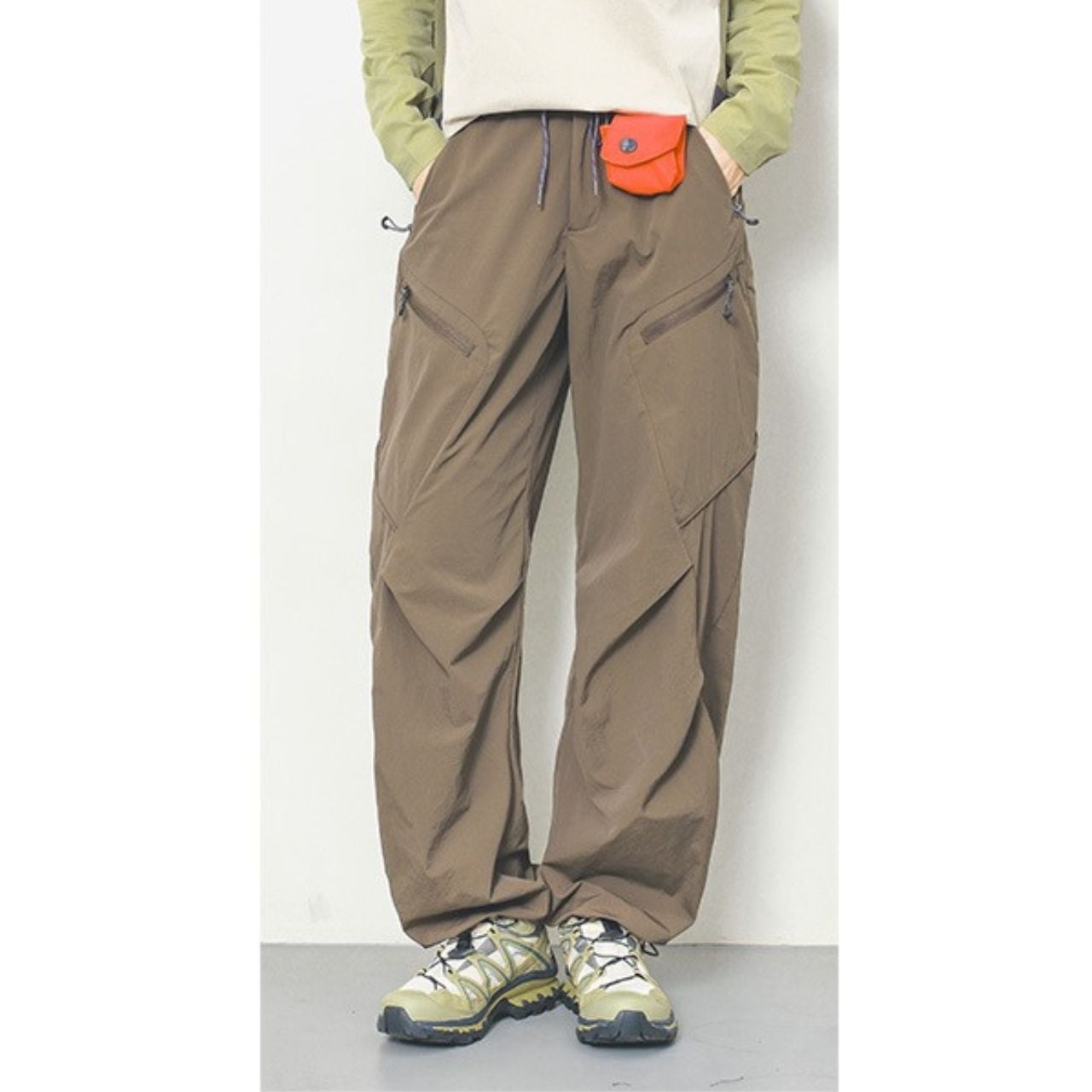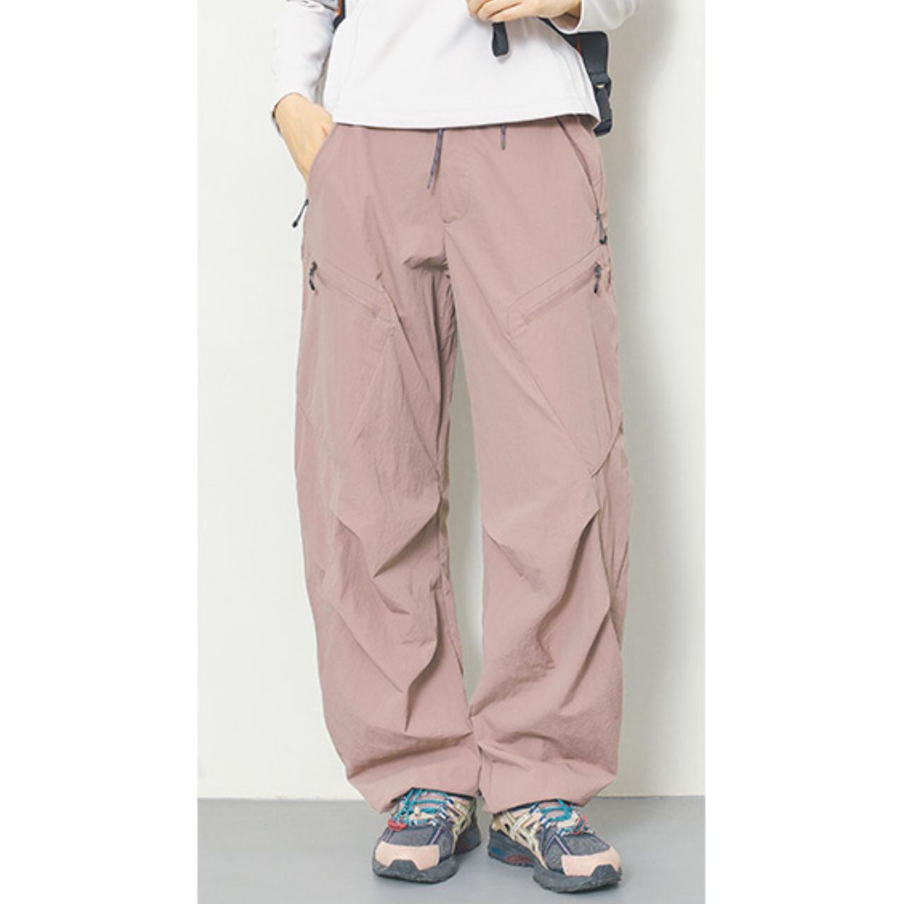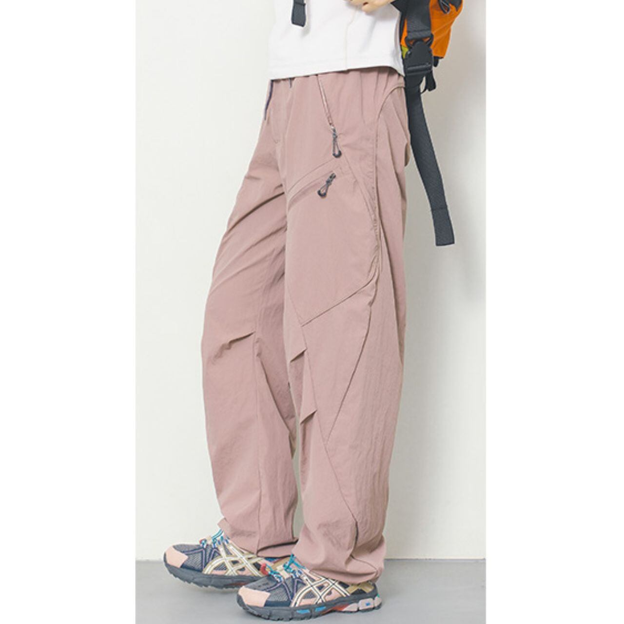マルチポケット付きのパラシュートパンツ。