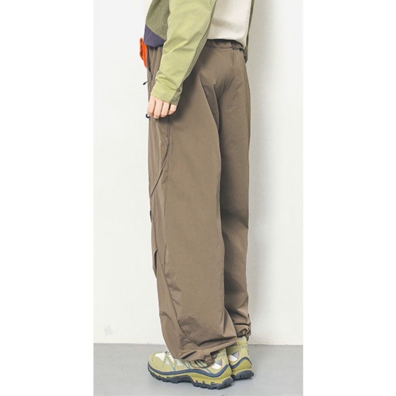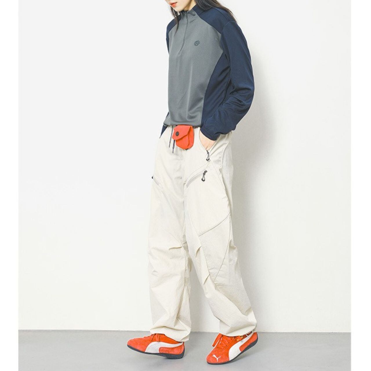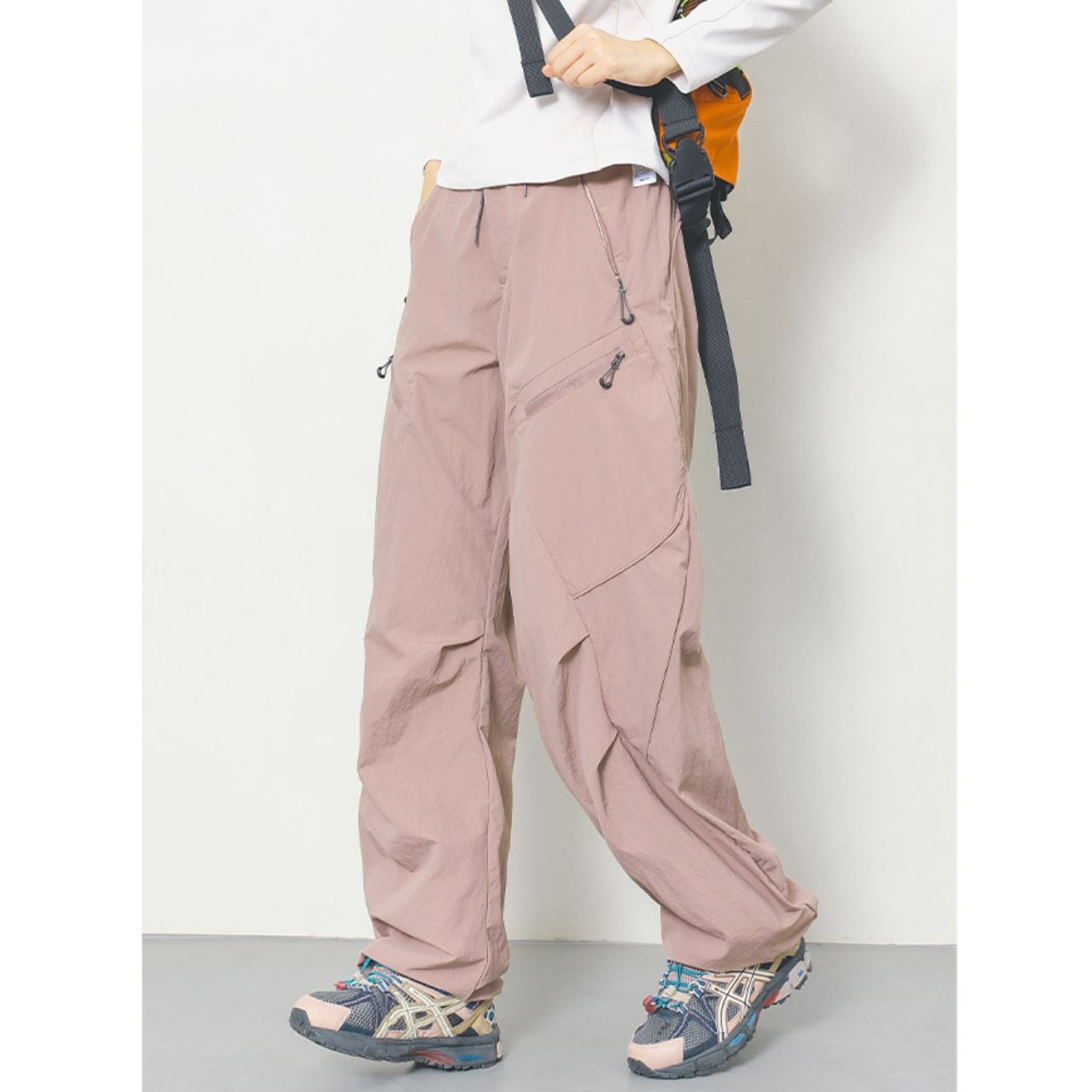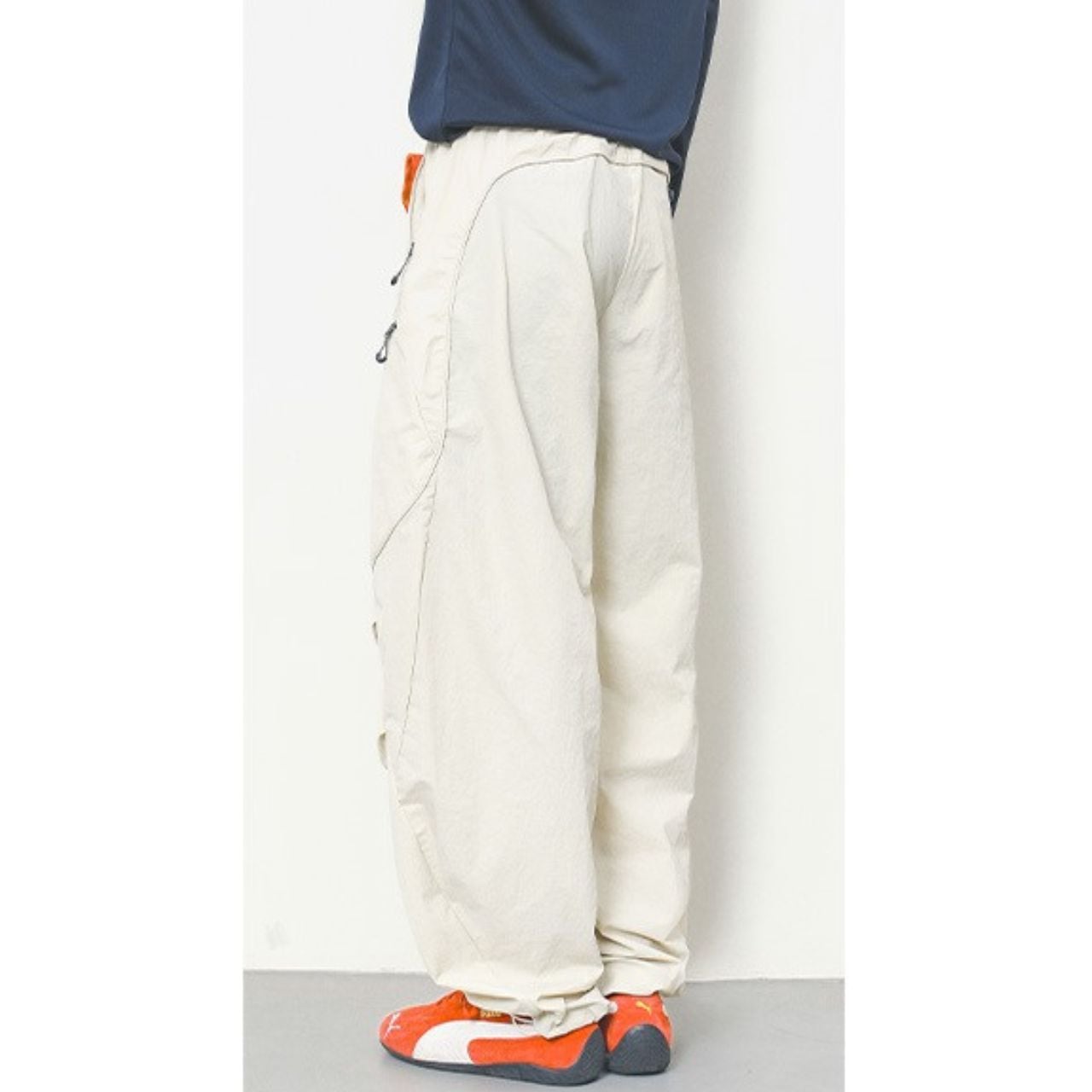 マルチポケット付きのパラシュートパンツ。