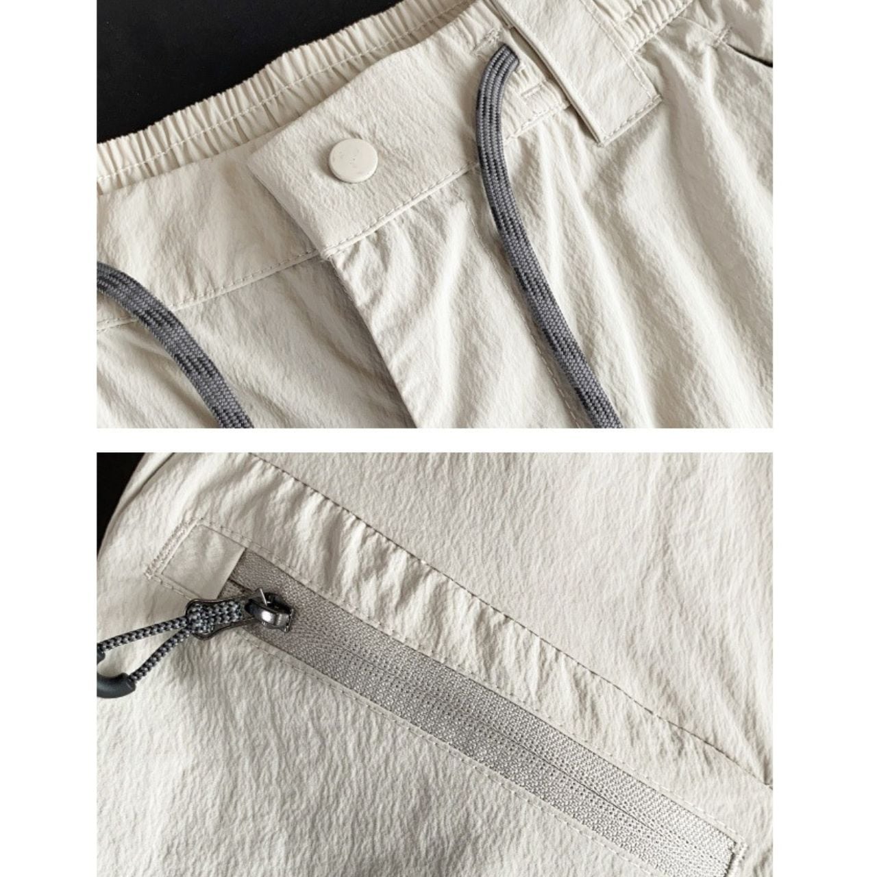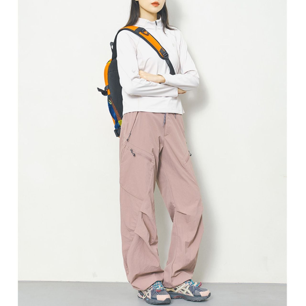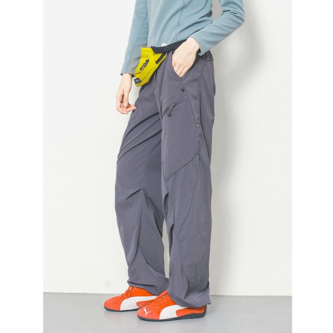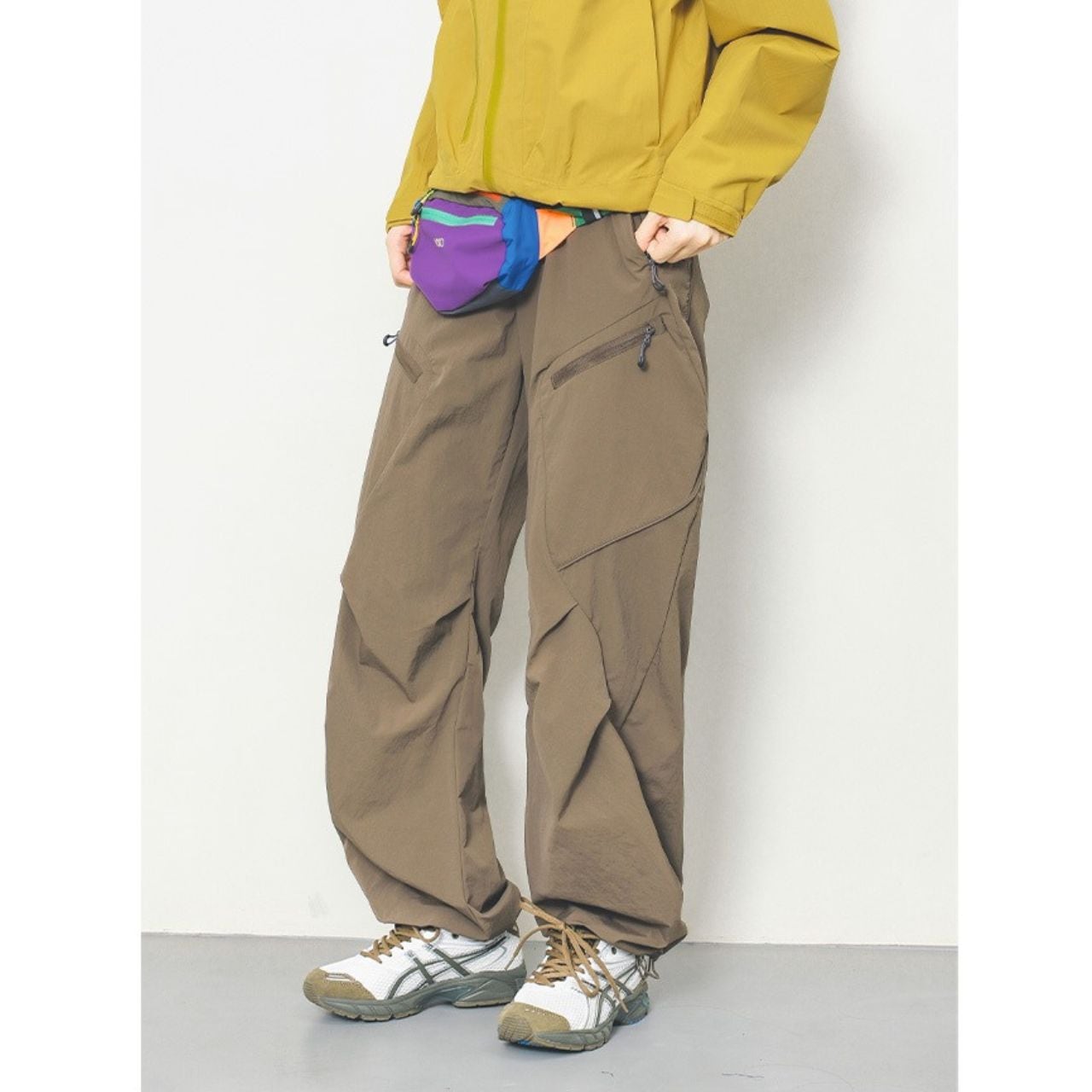 マルチポケット付きのパラシュートパンツ。