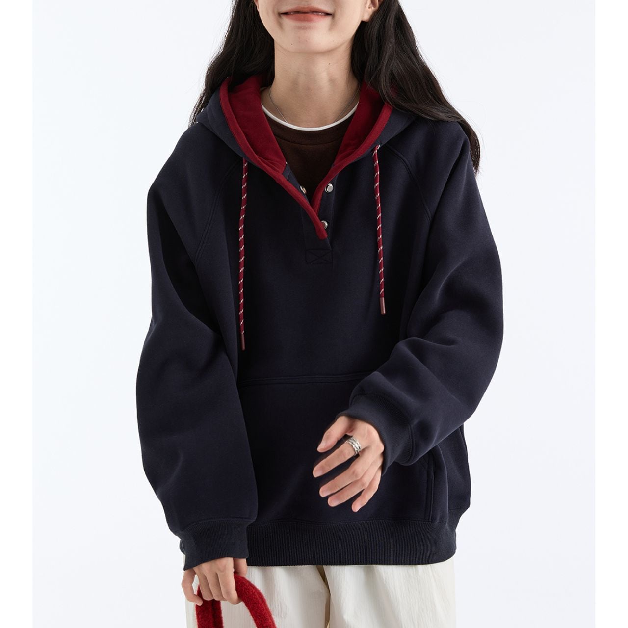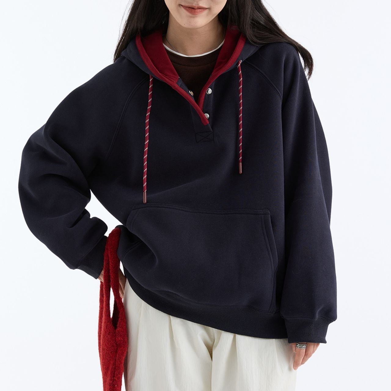 バイカラーデザインが目を惹くスウェットフーディー。