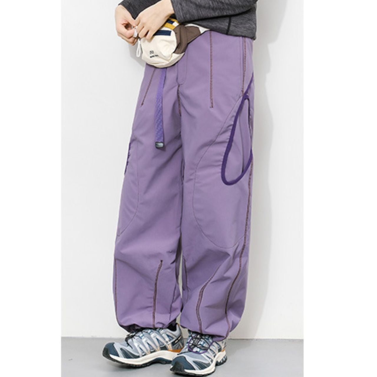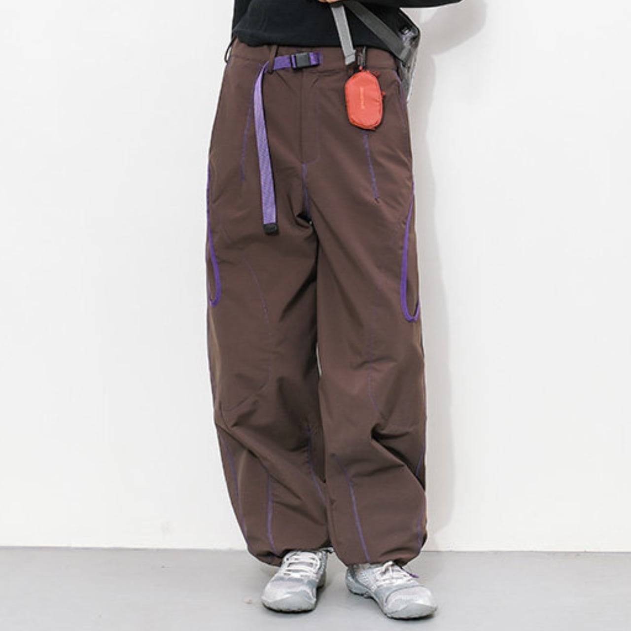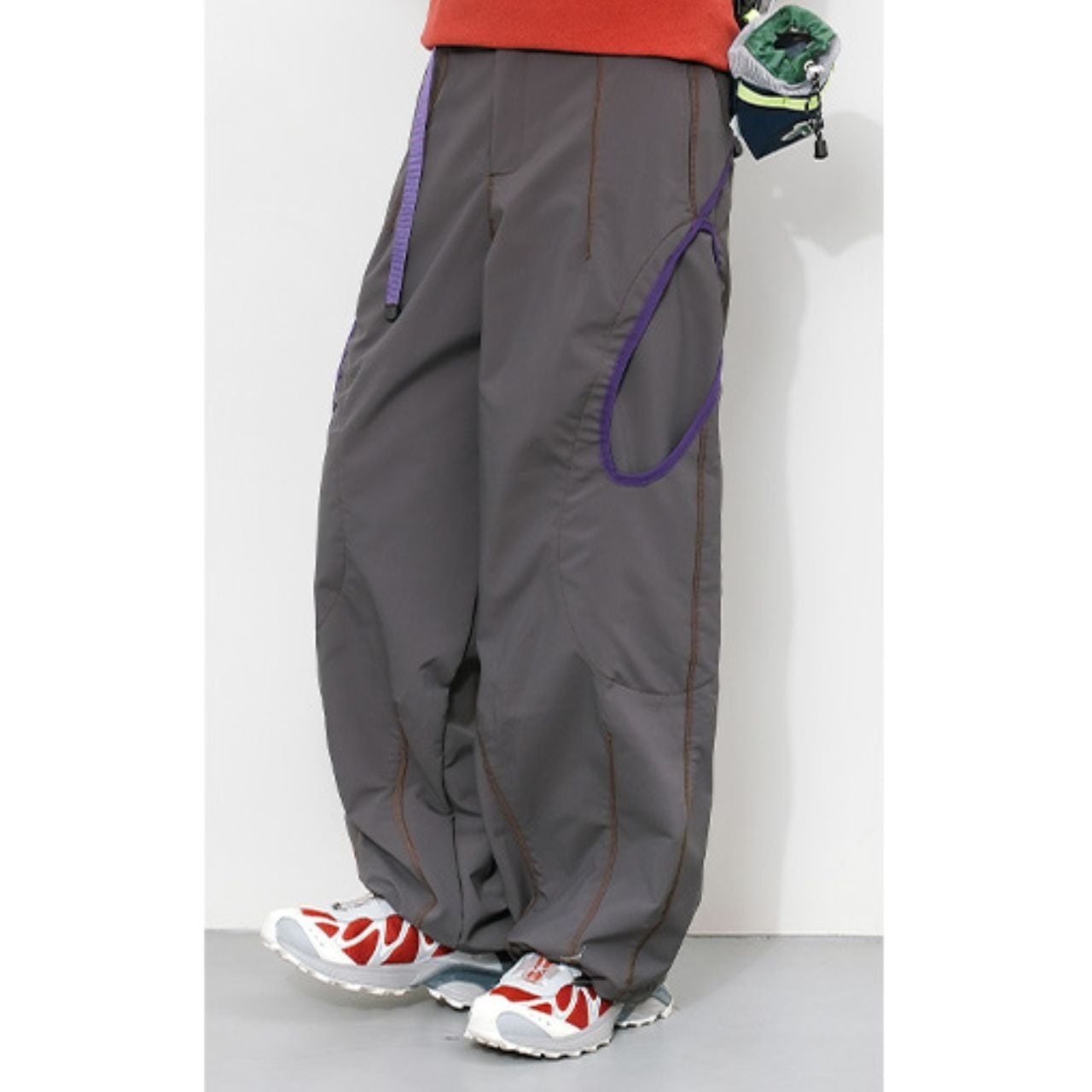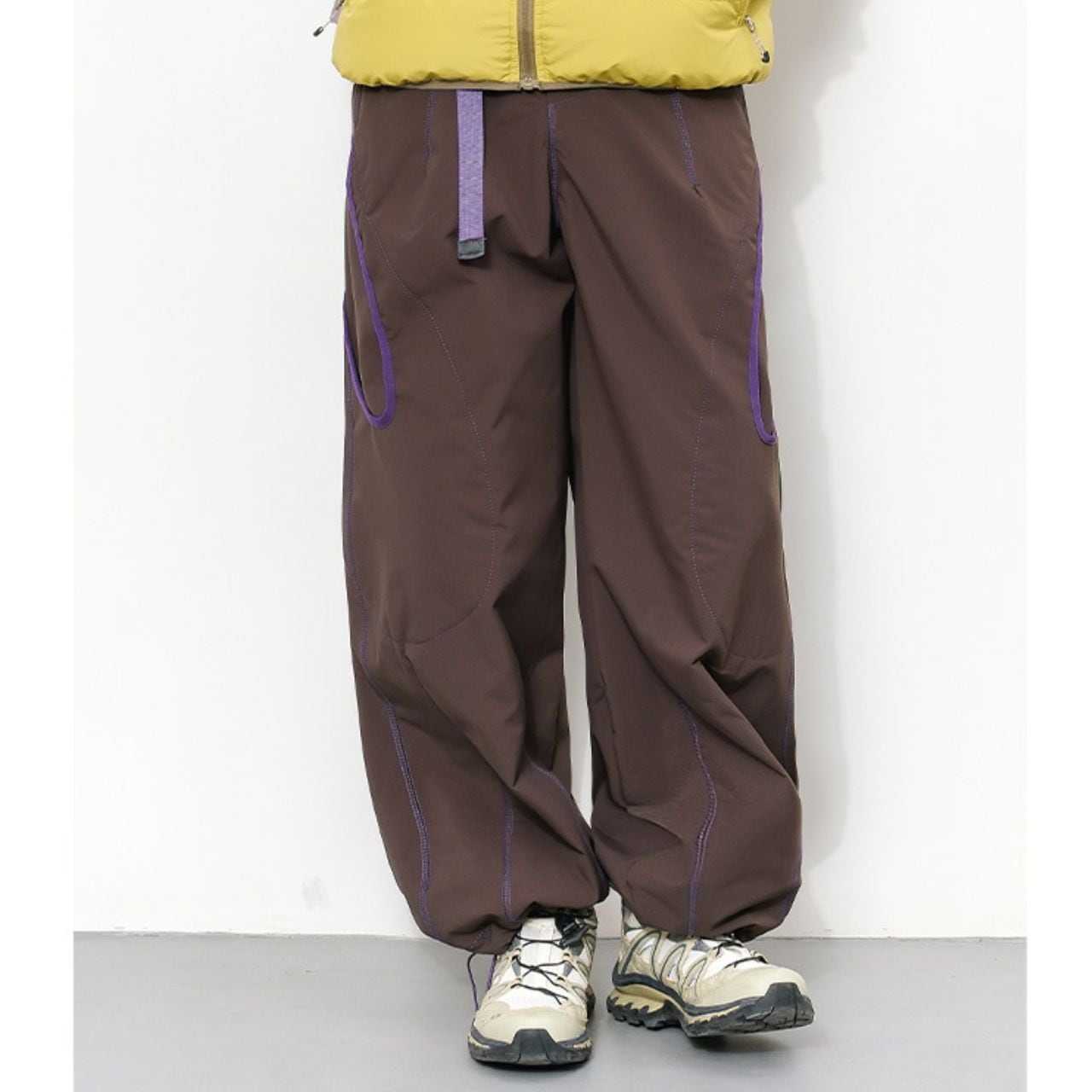 配色ステッチが映える、コントラストデザインのトレイルパンツ。
