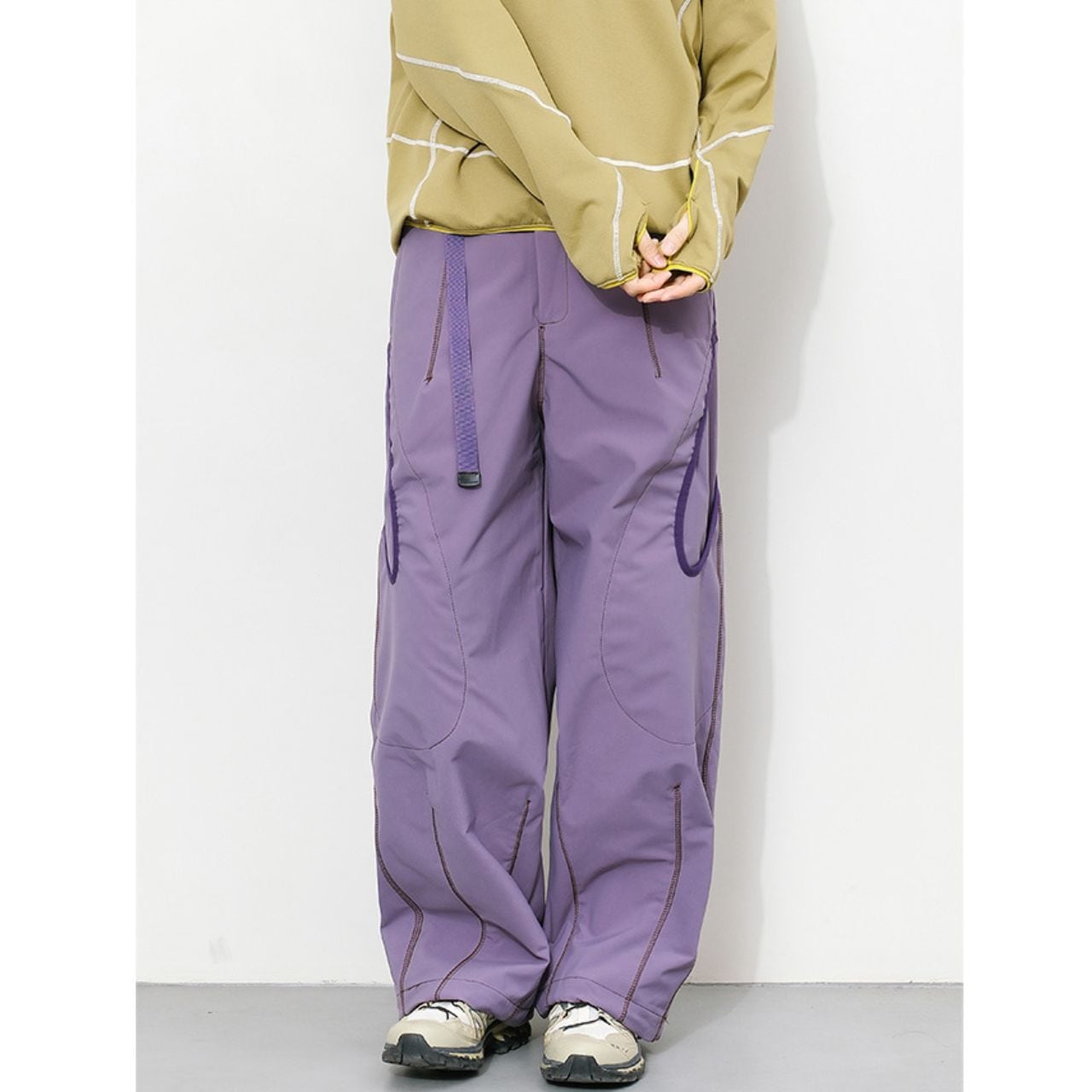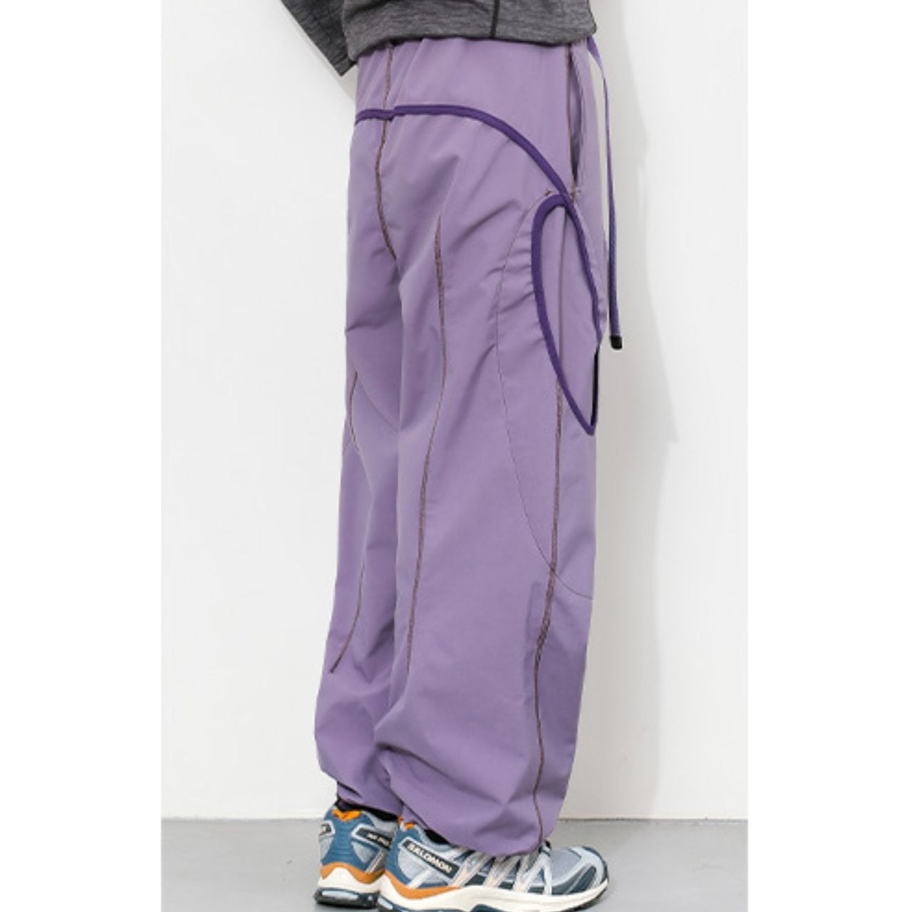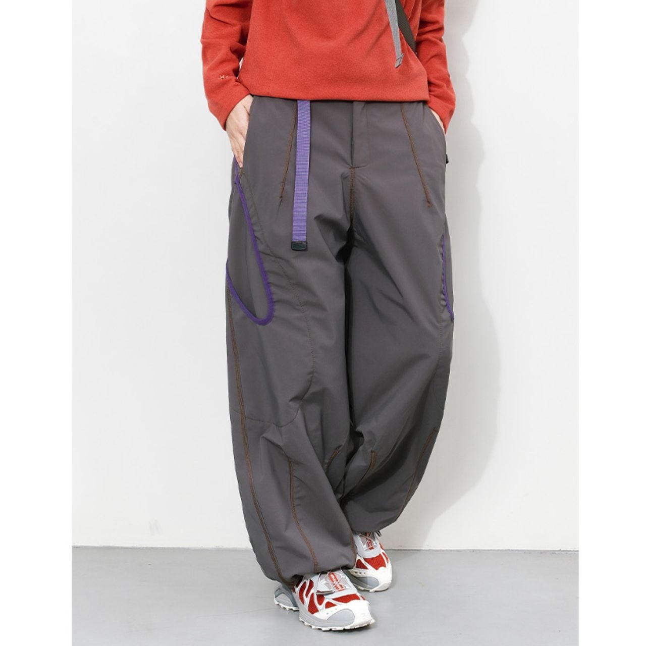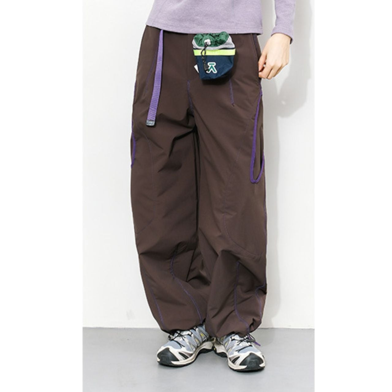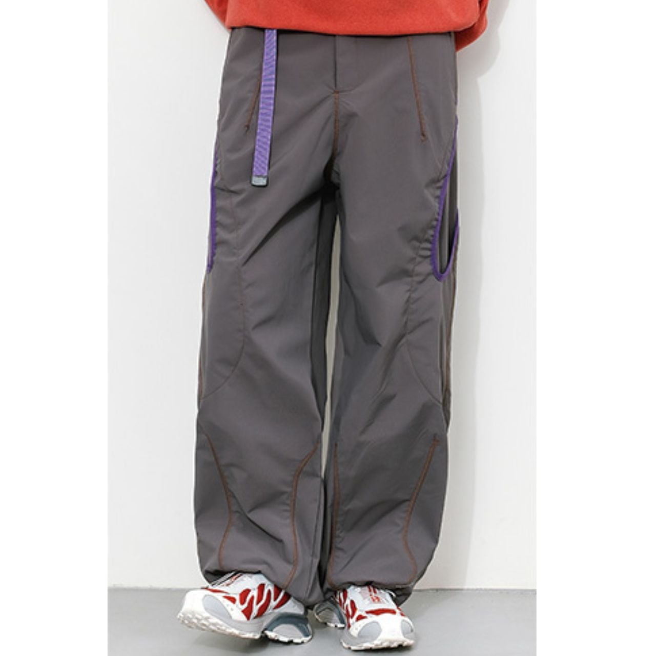 配色ステッチが映える、コントラストデザインのトレイルパンツ。