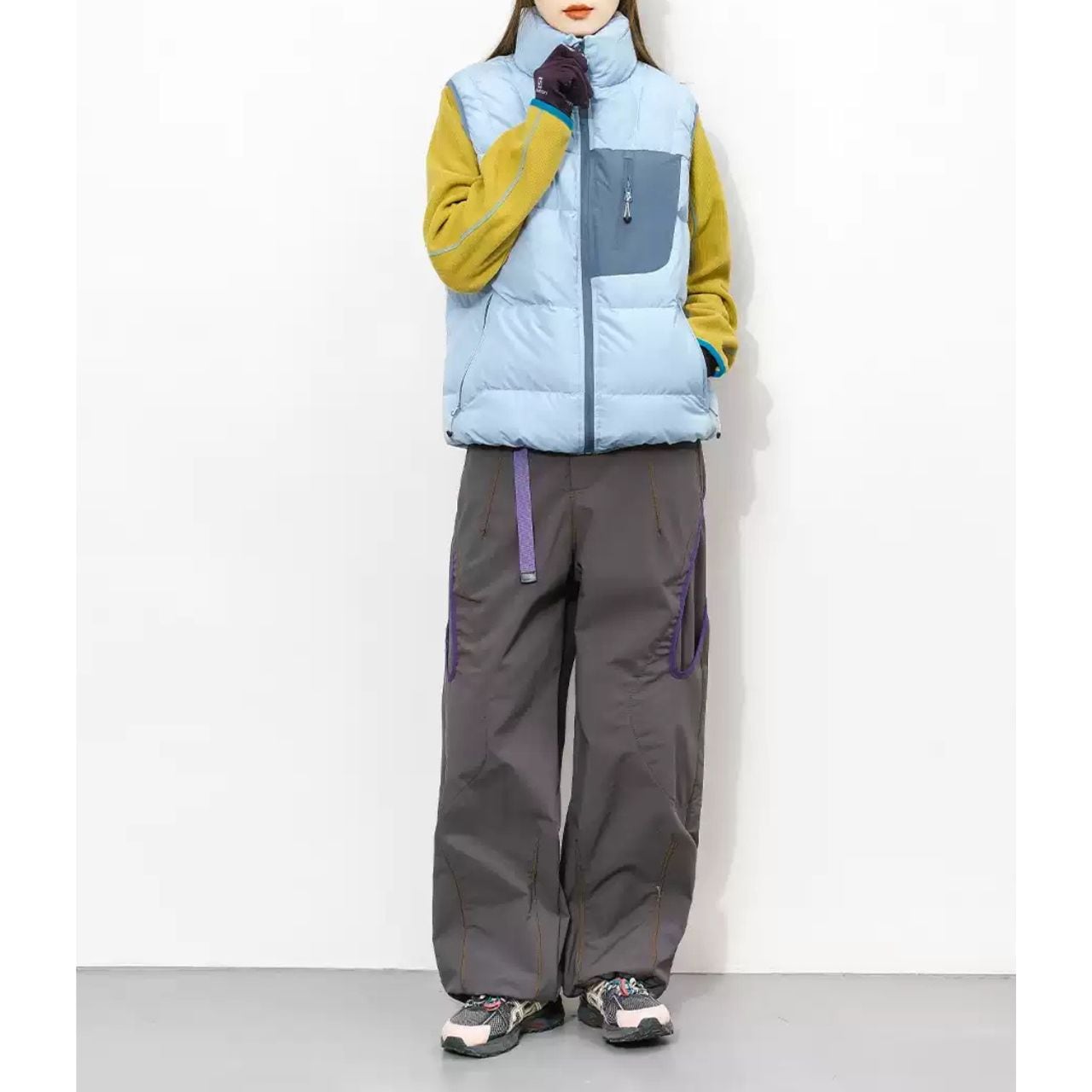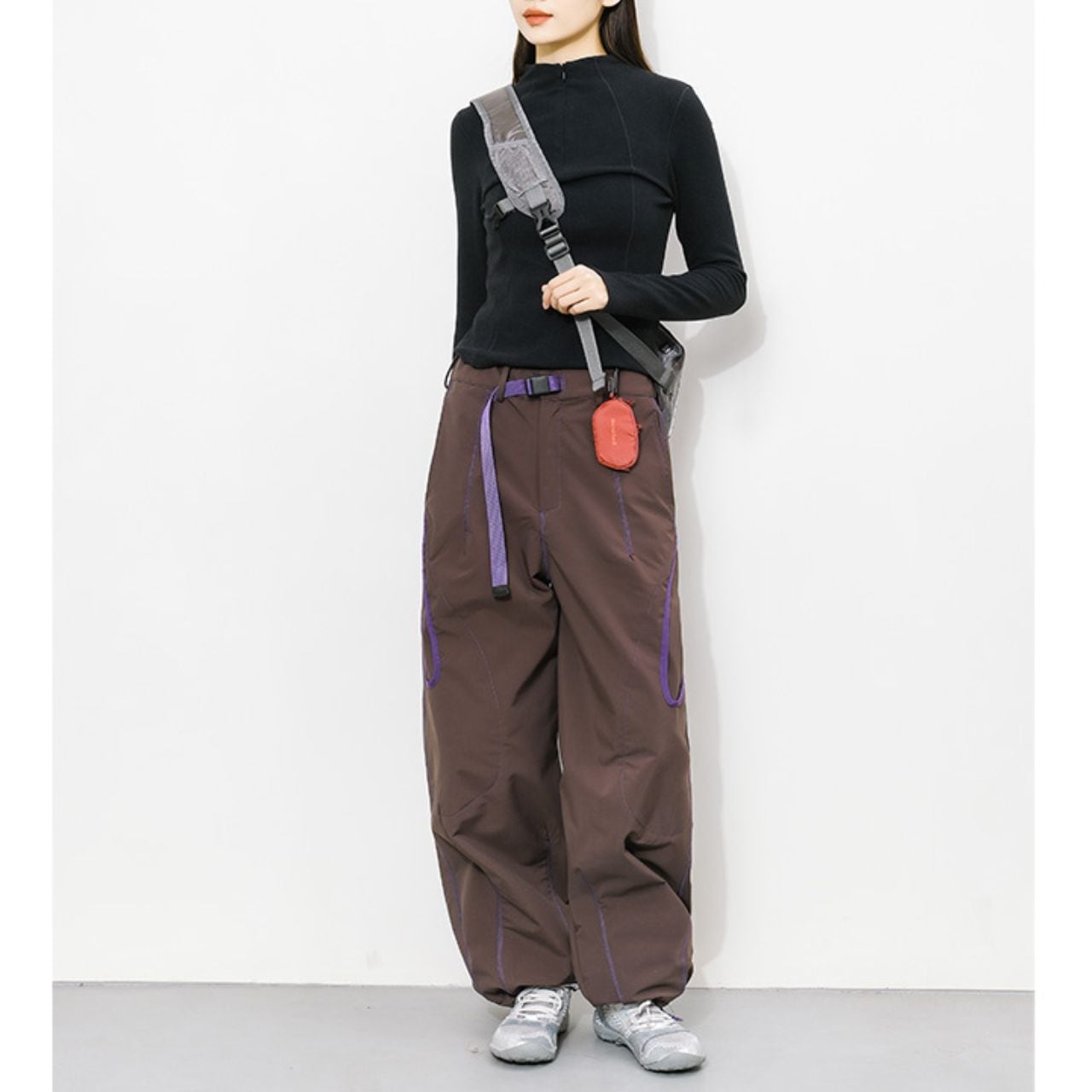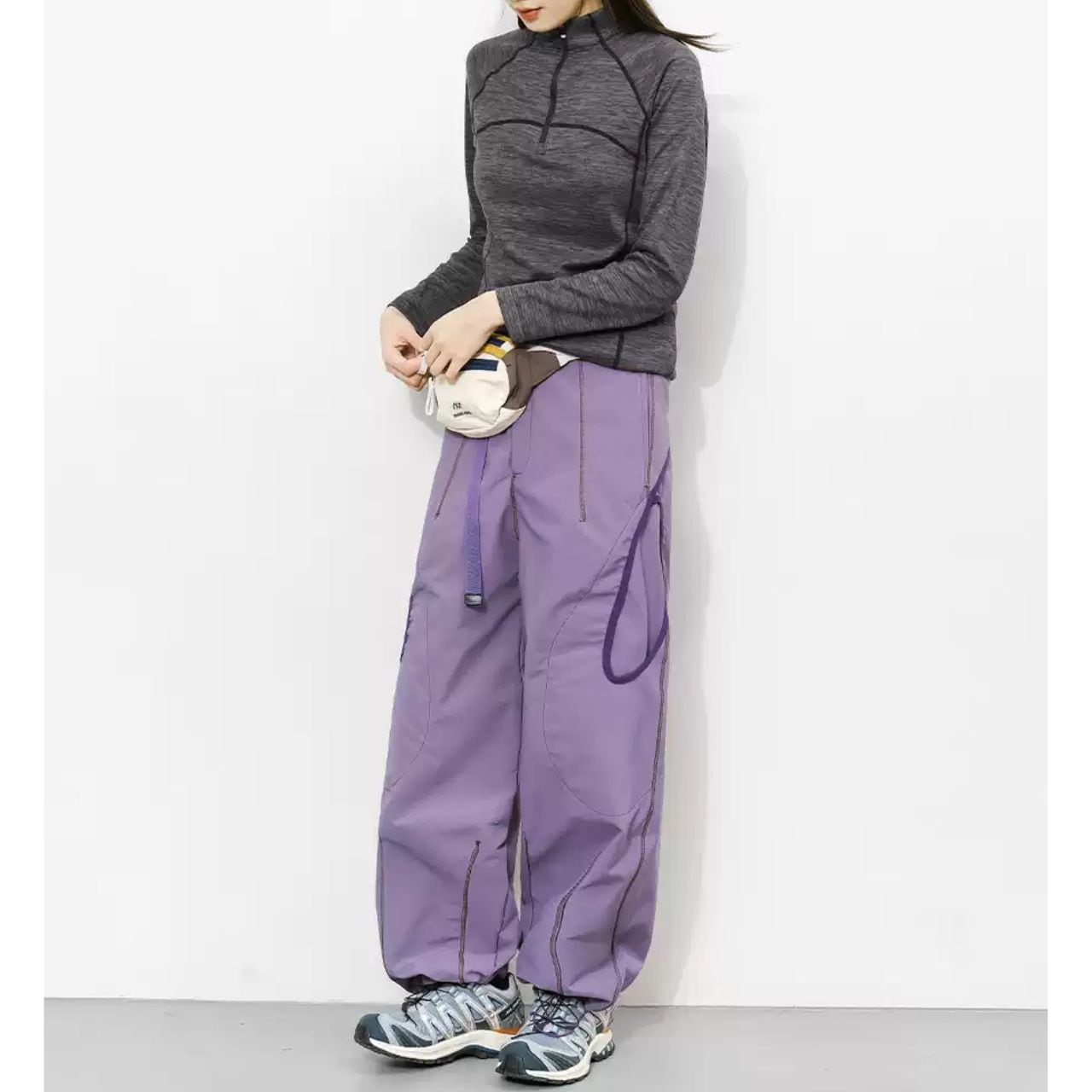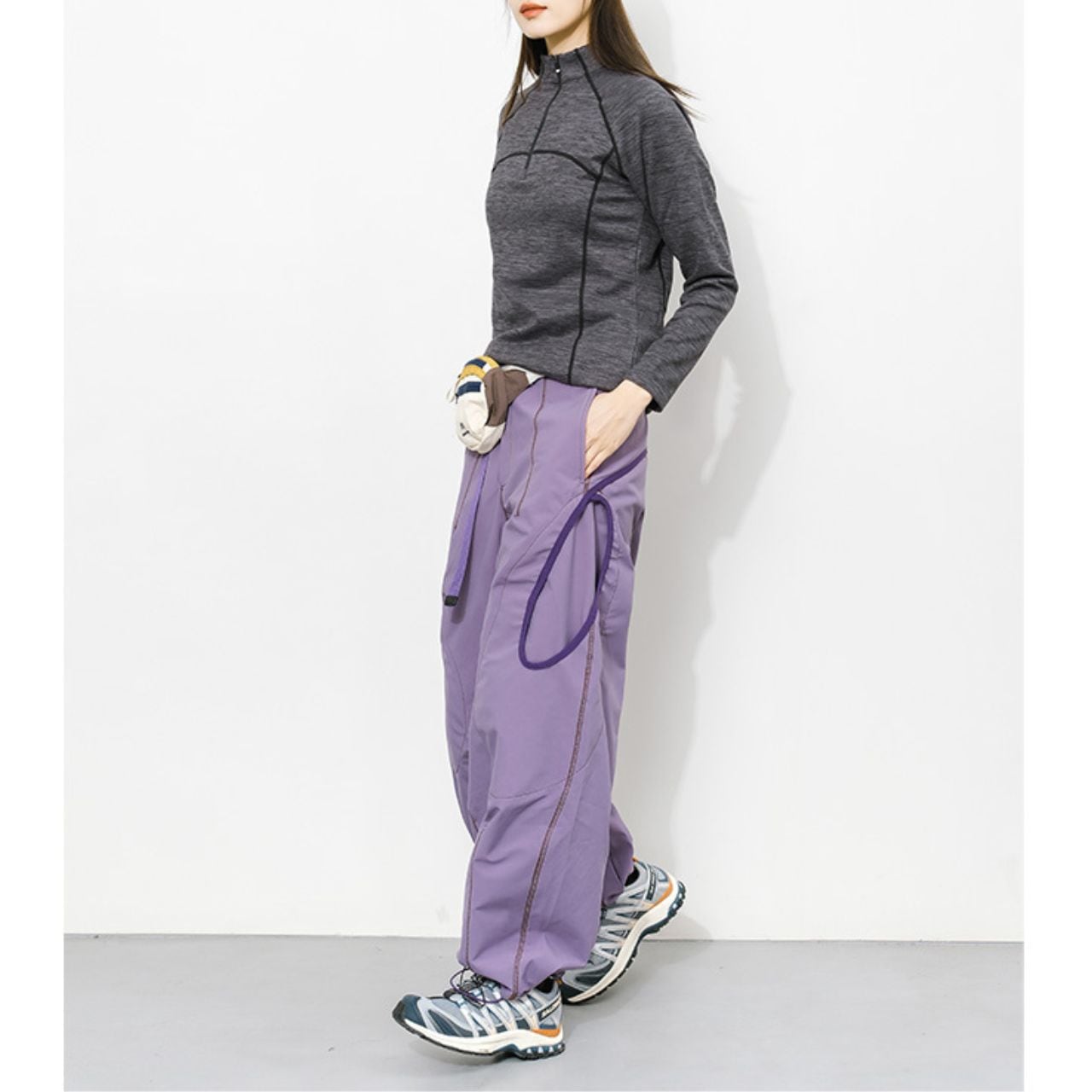 配色ステッチが映える、コントラストデザインのトレイルパンツ。