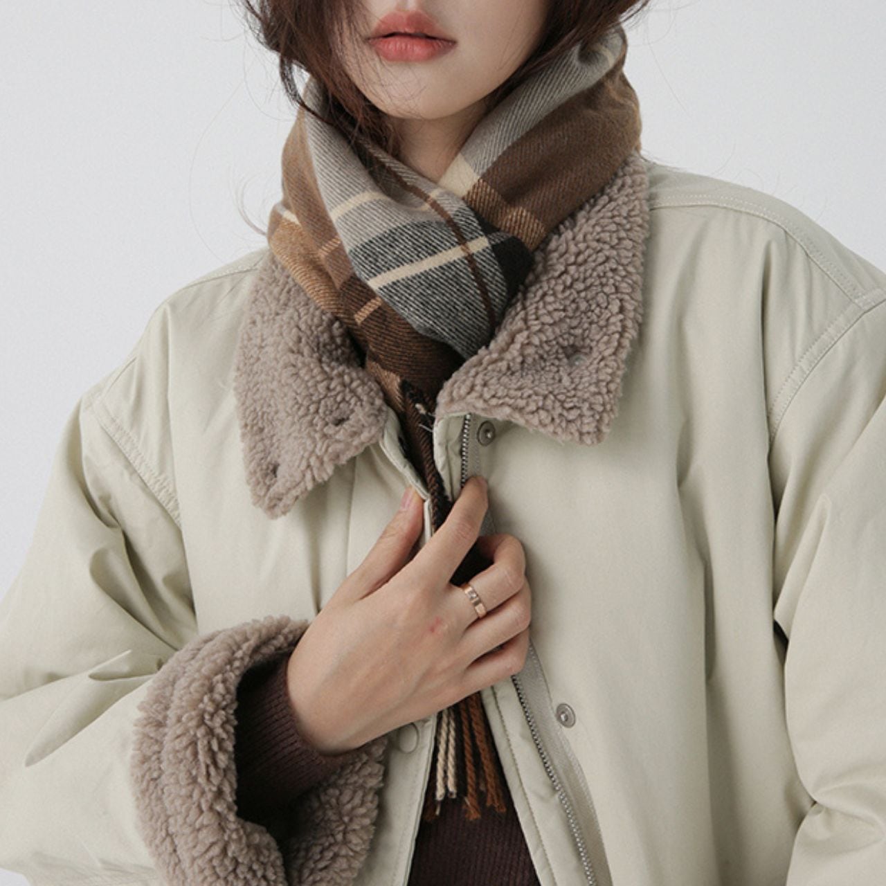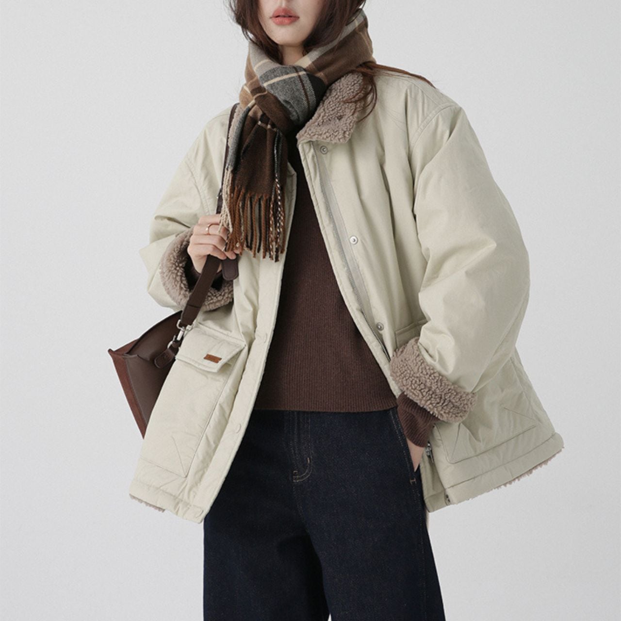 襟元と袖口のボアがカジュアルなスタイルにさりげないアクセントをプラスします。